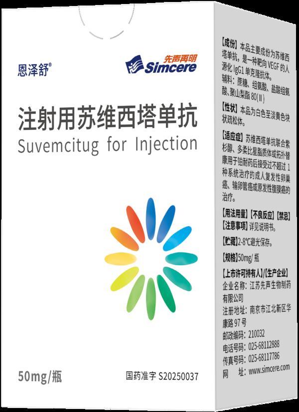 2025年7月3日,据国家药品监督管理局网站消息,一款国产抗血管生成靶向一类新药注射用苏维西塔单抗获批上市(批准文号国药准字S20250037,批准日期2025年6月30日)。该药由先声药业集团旗下先声再明公司研发,适用于联合紫杉醇、多柔比星脂质体或拓扑替康用于铂耐药后接受过不超过1种系统治疗的成人复发性卵巢癌、输卵管癌或原发性腹膜癌的治疗,成为中国首个覆盖全人群的铂耐药卵巢癌靶向药物。